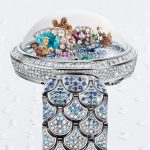 Under a cabochon-inspired dome, Bulgari recreated a miniaturized living aquarium in the Divas’ Dream Acquarium watch. Over a dial paved with degradé Paraiba tourmalines, sapphires and diamonds, two fishes, – each of them enriched with two pear-shaped stones: the former with rubies and rubellites, the latter with Paraiba tourmalines and sapphires, – swim thanks to a sophisticated jewelry technique. At the same time, set on tremblers, corals, shells and stones float like in the sea world. Adding extra preciousness, the white gold flexible bracelet is paved with Paraiba tourmalines, sapphires and diamonds, while the case back is hand engraved with a dedicated marine drawing.