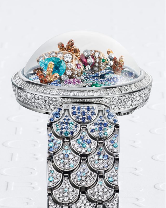 The Giardino Marino Grande secret watch, that required more than 3,900 hours to be completed, steals the spotlight with an exceptional combination of fishes, seashells, anemones set on tremblers, mobile corals, and decorated beads, all crafted from over 4,800 colorful precious stones and gems, carefully matched to obtain vibrant color effects. By the lively reef, two sea world treasures can be discovered: a starfish showing a central 3,96-carat cabochon rubellite, and a seashell paved with diamonds and Paraiba tourmalines. Both detachable, they can be worn as earrings complementing the watch. Another sapphire-paved shell opens by pressing the round diamond revealing a pearl inside. The last treasure is hidden behind the central fish: the dial of the watch powered by the Piccolissimo micro mechanical movement. With a 12mm diameter, a thickness of 2.50mm and a weight of just 1.30 grams, Bulgari’s Piccolissimo is the smallest round mechanical caliber on the market and a testament to the Maison’s art of miniaturization. Exceptional craftsmanship and vibrant colorful stones meet watchmaking know-how to reveal a true masterwork.