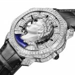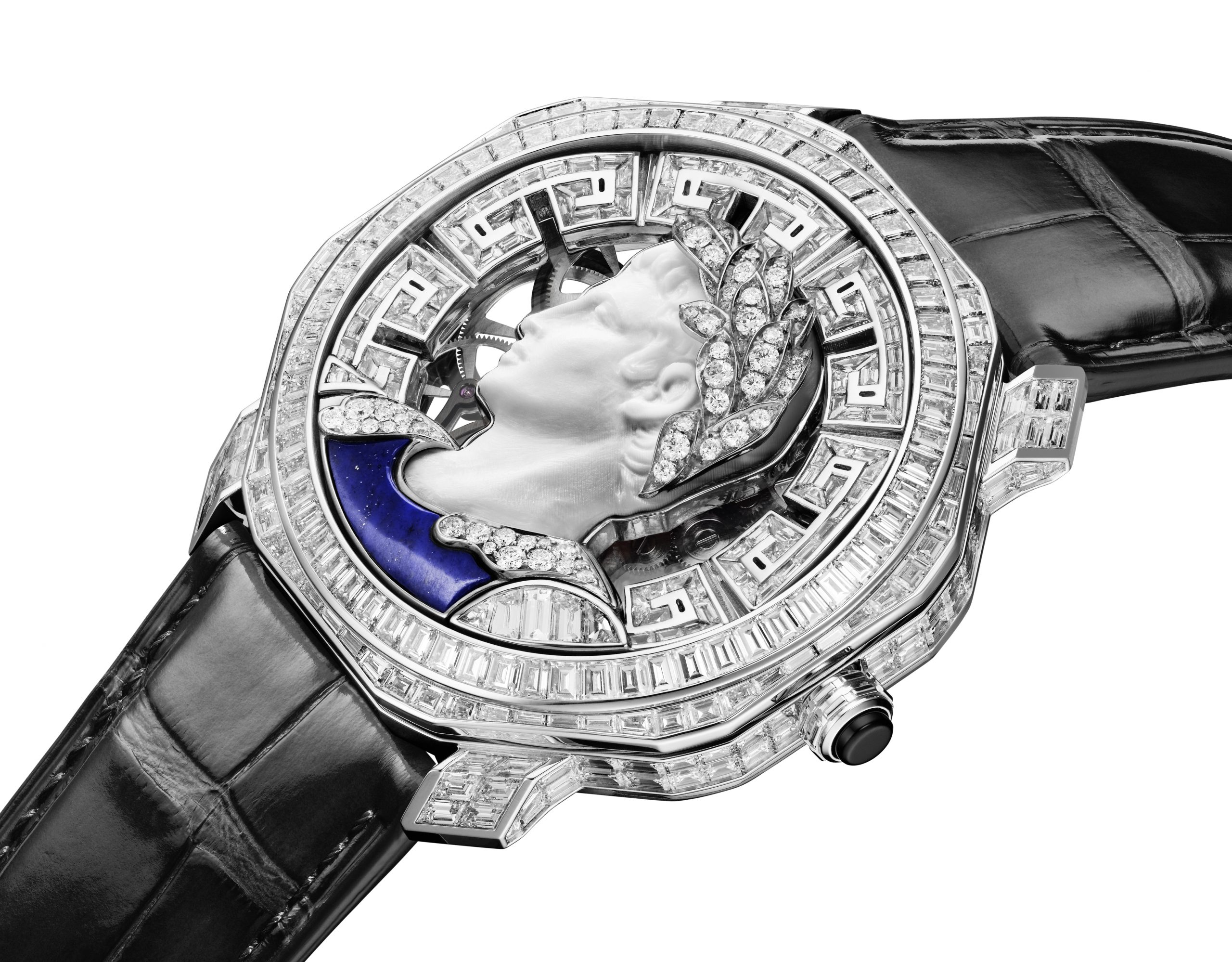 Introducing men’s pieces in its High-End Watches collection, the Roman house unveiled an extraordinary timepiece mixing the most exquisite high-jewelry craftsmanship with Swiss watchmaking precision. The one-of-a-kind Octo Roma Secret Watch Cameo Imperiale seduces with a platinum cap where the profile of the Roman emperor is made in cameo and set with diamonds and lapis lazuli. Showing a precious 44 mm platinum case with diamonds and a black alligator strap, it reveals an ultra-thin manual winding mechanical movement, BVL 268 SK caliber with flying tourbillon. This mechanism is an openworked version of the brand’s record-breaking tourbillon movement. With a thickness of just under 2mm, it features a sleek and refined profile, making it a true standout in the world of fine watchmaking.