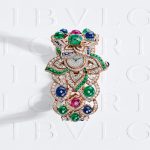 Taking inspiration from the Serpenti watch designed by Bulgari for Elizabeth Taylor when she was playing the main role in Joseph L. Mankiewicz’s Cleopatra movie, the Serpenti Misteriosi Dragone secret watch shows a white gold dragon head covered with diamonds and featuring 2 pear-shape emerald eyes. The three-twirl white gold bracelet enriched with round brilliant-cut diamonds and emeralds completes an extraordinary timepiece, that offers an incomparable comfortable fit. Revealing Bulgari’s omnipresent playful touch, the snake head opens by pressing the little tongue and reveals a dial that can be easily turned, enabling to wear the timepiece either on the left or on right wrist, as it happened with the heritage piece. This extraordinary creation is powered by the brand’ smallest mechanical movement.