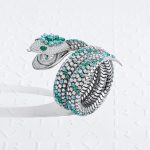 Sinuously wrapping around the wrist, the new Serpenti Misteriosi Pallini secret watch is inspired by 1955’s yellow gold and diamond Serpenti secret watch. Thanks to the introduction of the Piccolissimo movement, for the first time featured in a Pallini watch, the proportions were significantly reduced guaranteeing an elegant aesthetic balance and impeccable fit. Showing Bulgari’s status as the master of colored gems, emeralds, Paraiba tourmalines and diamonds are wonderfully combined in this exclusive creation and are set on tremblers guaranteeing dynamic movement for this patented bracelet design. The white gold watch head is enriched with round brilliant-cut diamonds and two pear-shaped emerald eyes.