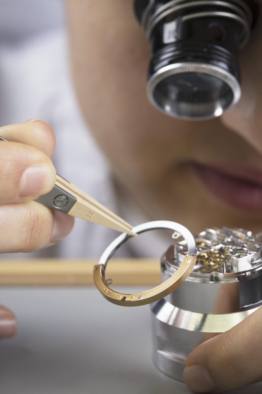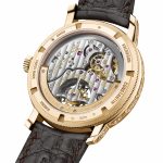 Operating at rate of 18,000 vibrations per hour (2.5 Hz) and positioned at 6 o’clock, the tourbillon – whose carriage bears the small seconds indication by means of a blackened screw – enlivens this ‘carnival of the animals’. It can also be admired through the sapphire caseback without being concealed by the oscillating weight. The movement construction incorporates a peripheral rotor winding the barrel to ensure a comfortable 80-hour power reserve. The choice of the peripheral rotor also contributes to the slenderness of Calibre 2160 which, despite the presence of the tourbillon, is barely 5.65 mm thick.