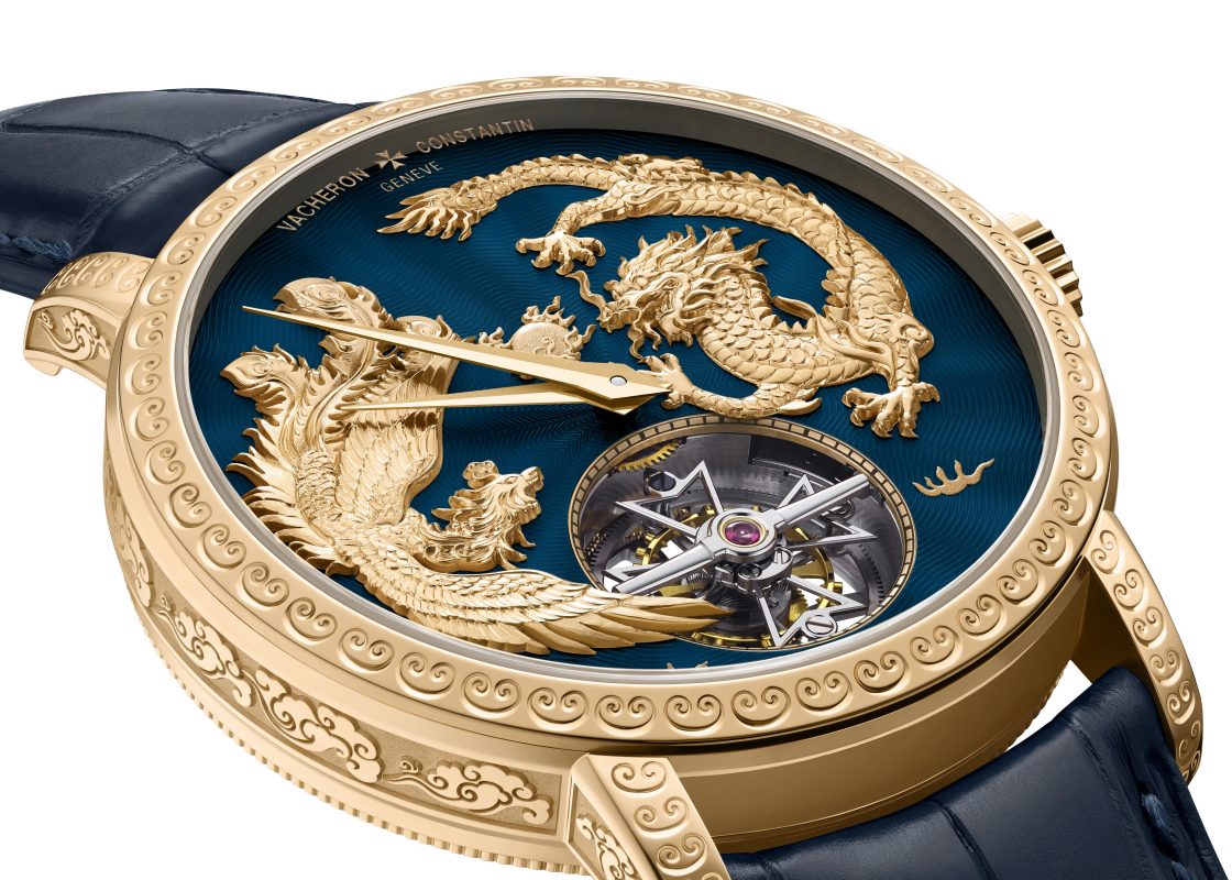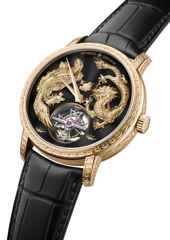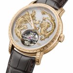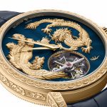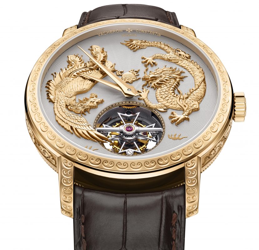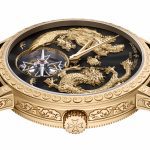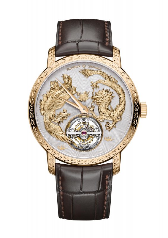 Thanks to the mobile tourbillon carriage shaped like Vacheron Constantin’s Maltese cross emblem, the entire scene comes to life, with the regulator serving as a support for one of the dragon’s legs, while the beating of the phoenix’s wings appears to set the tempo.