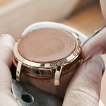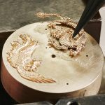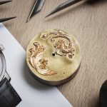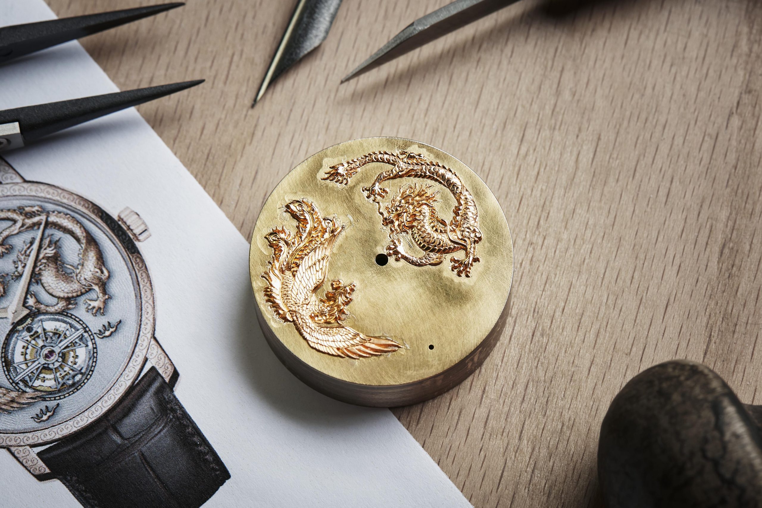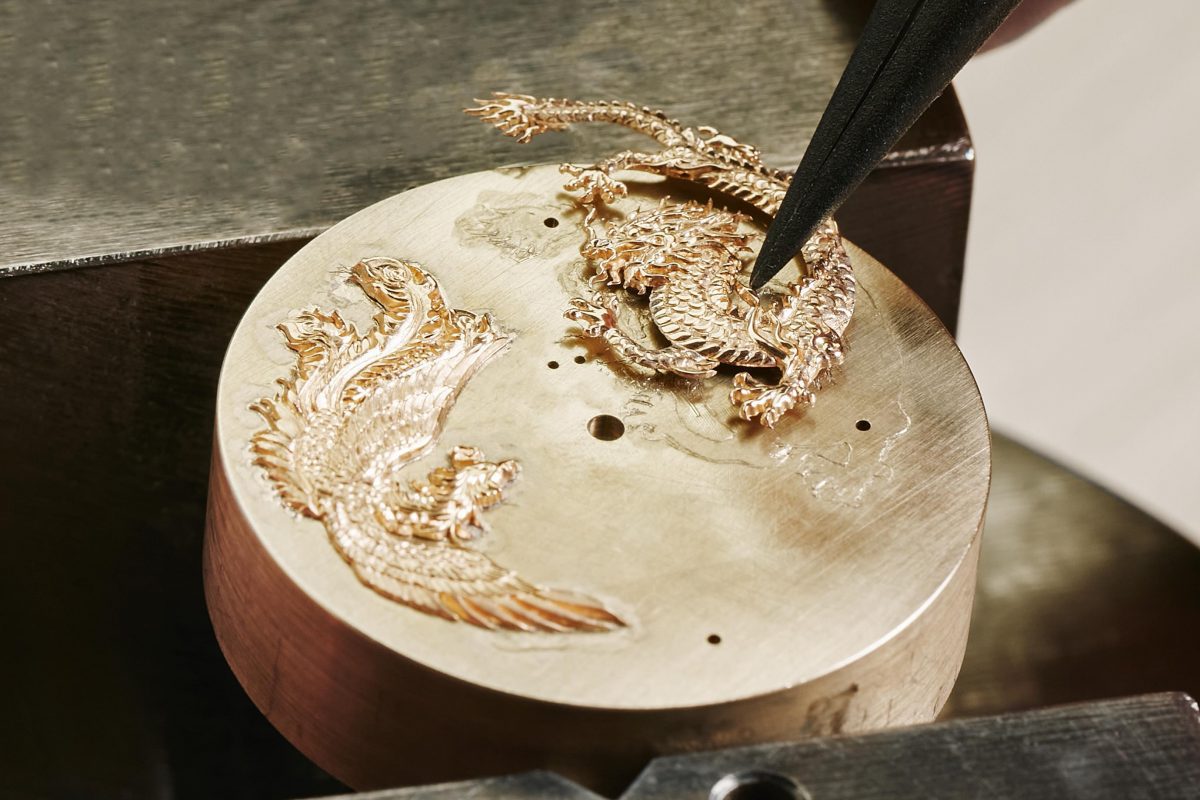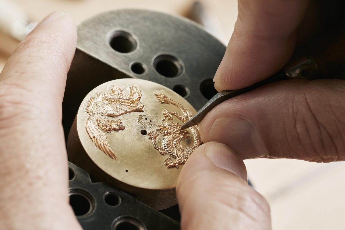 The Traditionnelle tourbillon watch illustrates the dance of Phoenix and Dragon around the pearl, a distinctive cultural symbol of China. The finishing of the latter indeed evolved during the production process: the pearl was initially to be polished and the flames sandblasted, whereas in fact the opposite was done manually due to its extreme thinness (3/10 of a mm). This change served to endow the model with genuine radiance thanks to these animals. The two fabulous creatures are represented in the form of 18K 5N pink gold appliques that are stamped and then hand-finished using the pounced ornament technique that involves modelling with a scorper and then smoothing the reliefs with a file. Together, the fine details and precise operations used to represent the plumage of the phoenix with a rooster’s head symbolising the Chinese empress; and the undulating body of the scale-covered dragon emblematic of the emperor, orchestrate a heavenly choreography.
