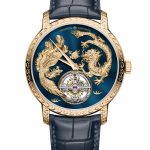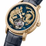 Legendary creatures from Chinese mythology, the Phoenix and the Dragon symbolise strength and grace: a perfect complementarity that procures peace and happiness. On the dial of the three models, the Phoenix and the Dragon come to life in the form of pink gold appliques sculpted on a hand-guilloché dial. The galvanic dial treatment in black, deep blue and silver tones distinguishes the three versions of the model, each issued in a 16-piece limited edition. The 41 mm-diameter case in 18K 5N pink gold is engraved with cloud-like volutes on the bezel and lugs, which form a bas-relief motif on the case middle. In-house self-winding Calibre 2160 with tourbillon was chosen to enliven this mythological scene. Measuring just 5.65 mm thick thanks to its peripheral rotor ensuring an 80-hour power reserve, this ultra-thin movement with 188 components has made it possible to offer an elegant case with a sapphire back providing a view of the finishing details.